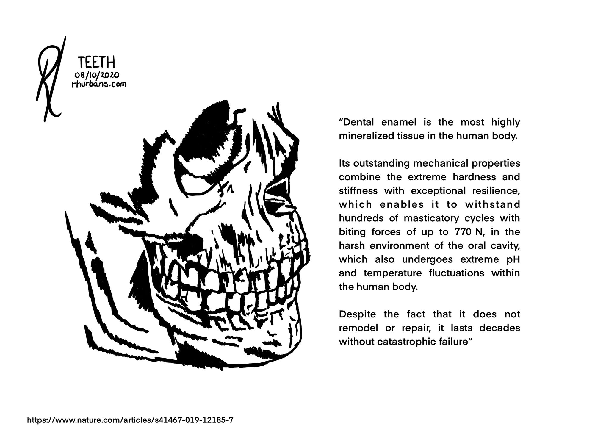 Tooth enamel is inherently weak. It has the fracture toughness comparable with glass, but it's resilient, and survives millions of contacts over a lifetime. Even after death, your teeth will persevere for thousands of years.