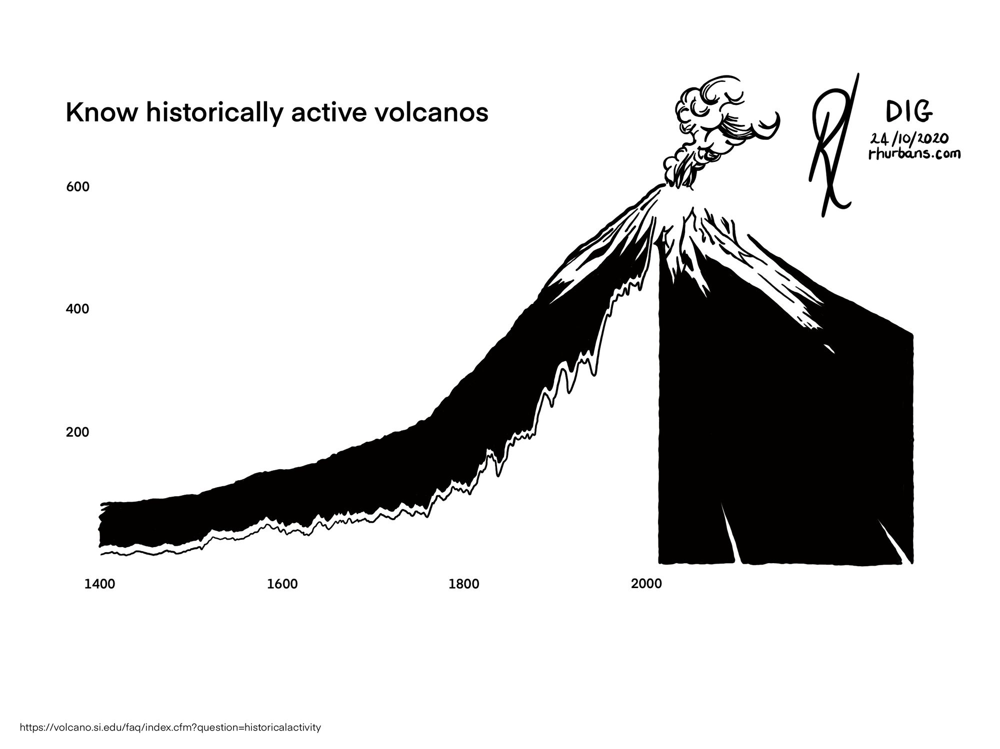 By looking at the history of volcanic activity, we may assume that it's increasing exponentially and we're doomed. However, data is dependent on people reporting it. The sharp increase in volcanic activity reports coincides with the growth of the population.