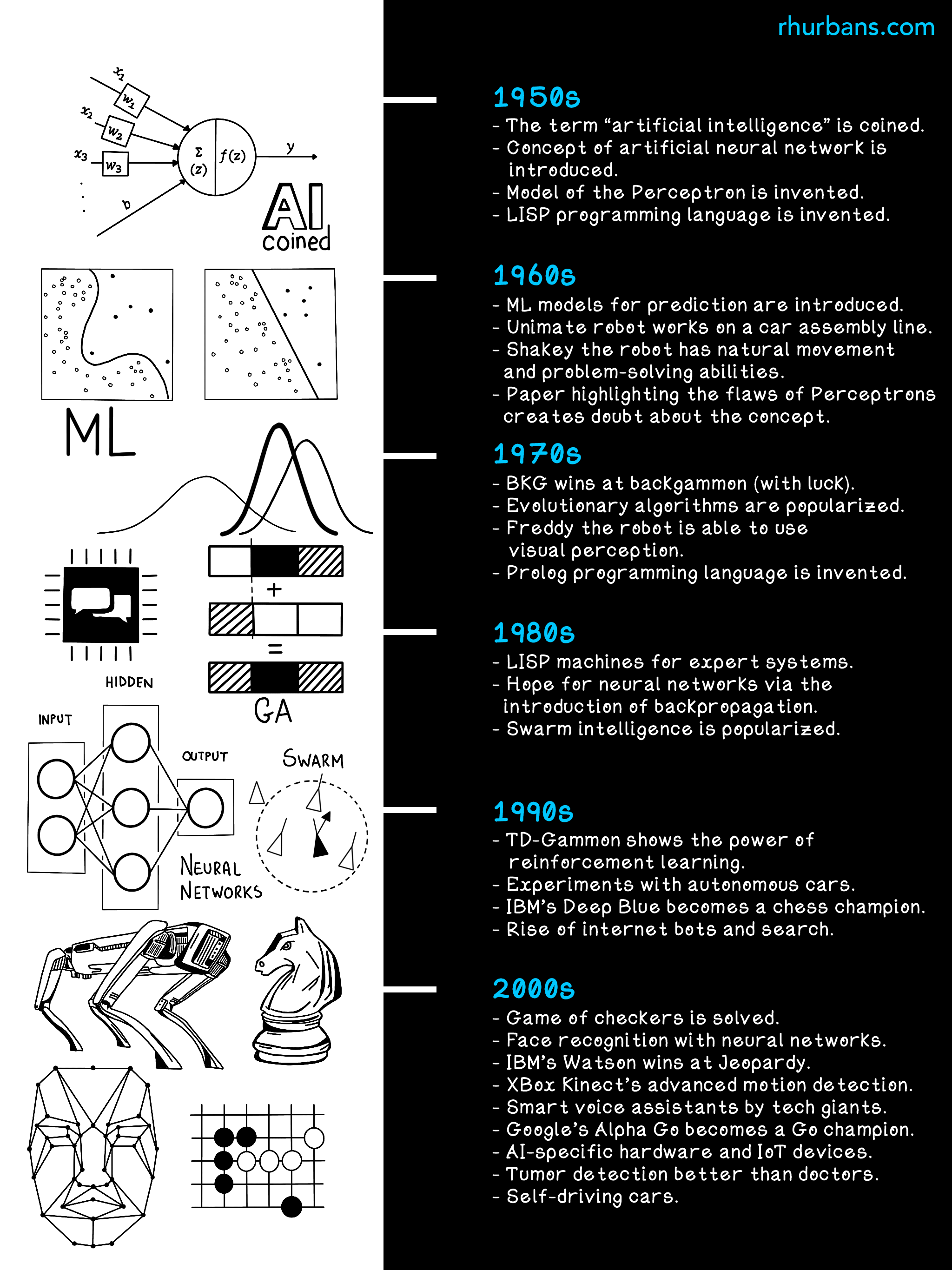 1960s: ML models for predictions are popularised. The Unimate robot works on a car assembly line. A paper highlighting flaws in the Perceptron creates doubts about the concept.