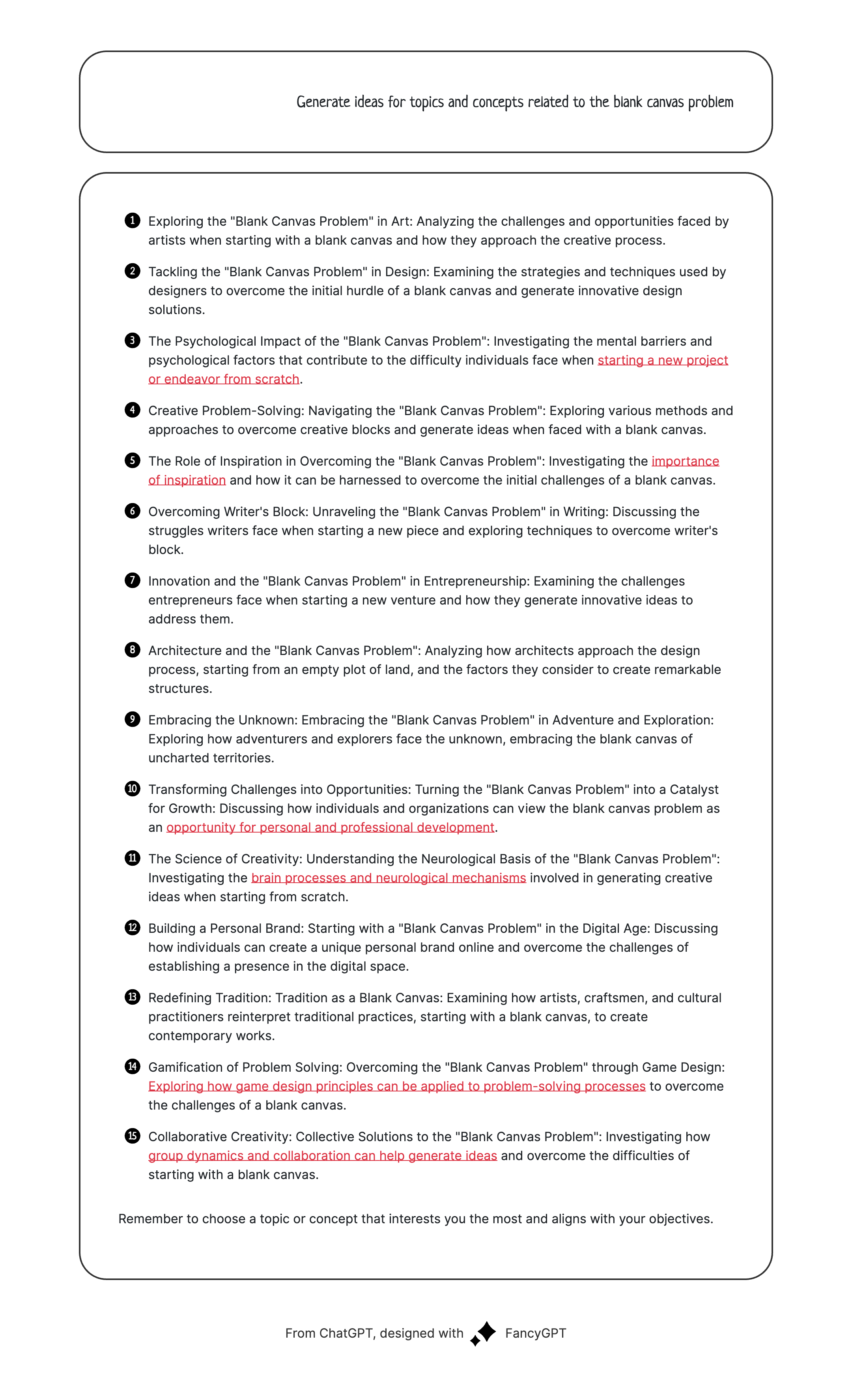 Our minds are powerful, but with an AI co-pilot, we can unlock thoughts and possibilities that we might not ever consider. Ask an AI for ideas, outlines, and concepts to consider related to the problem statement. It might be tempting to use AI generated ideas verbatim, but they're more useful when we interrogate, explore, and expand on them with our own experience and intuition. The highlighted areas in the ChatGPT thread below are interesting to me, and might deserve to be included in our ideation. Notice that they're sparse and overall quite abstract.