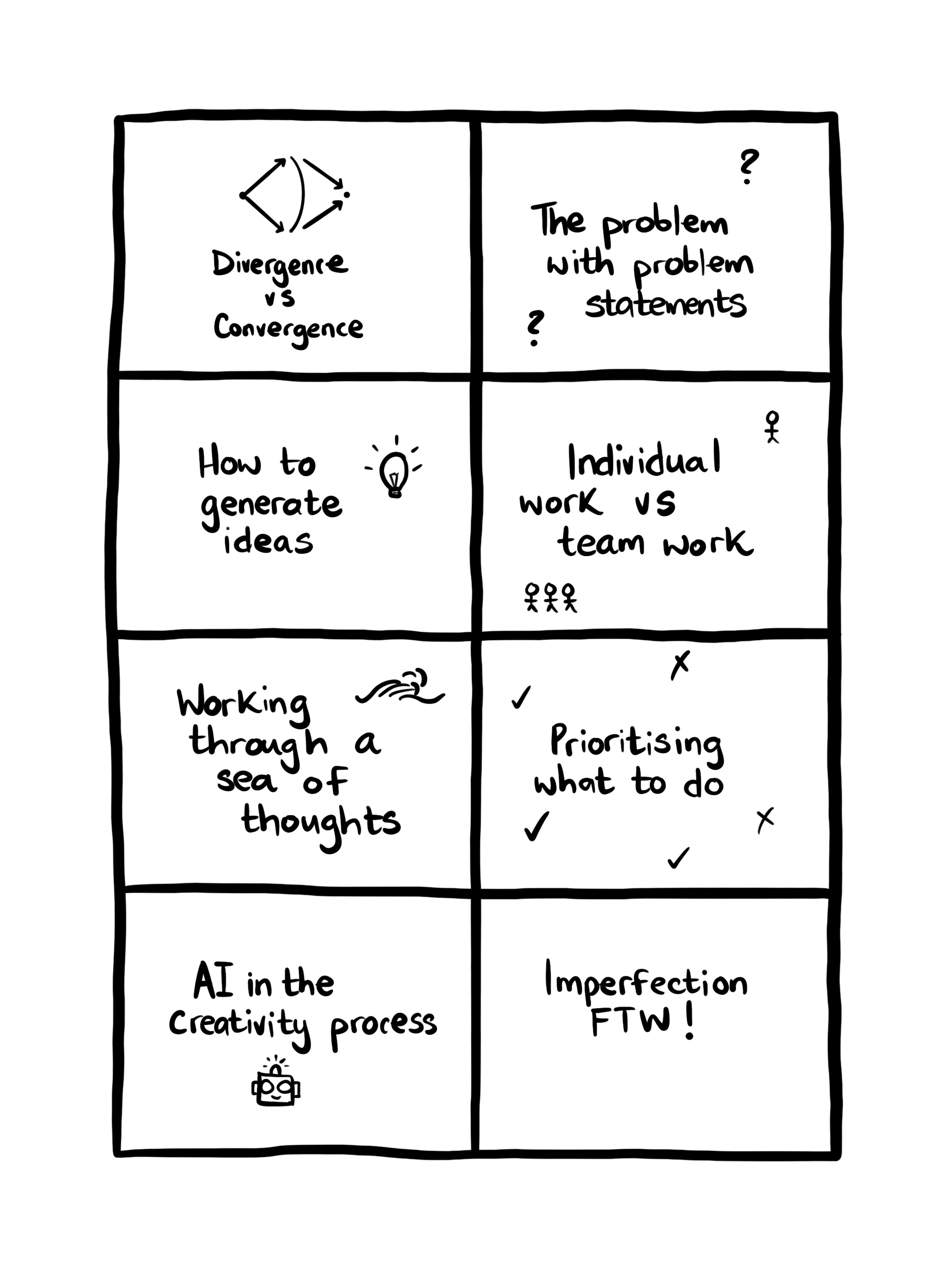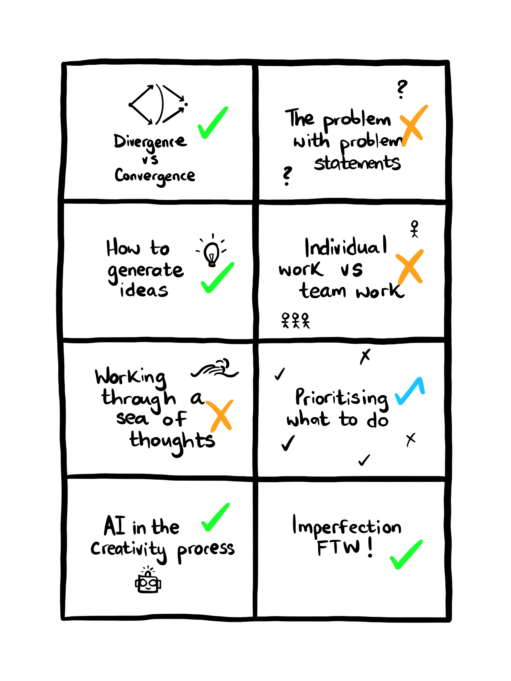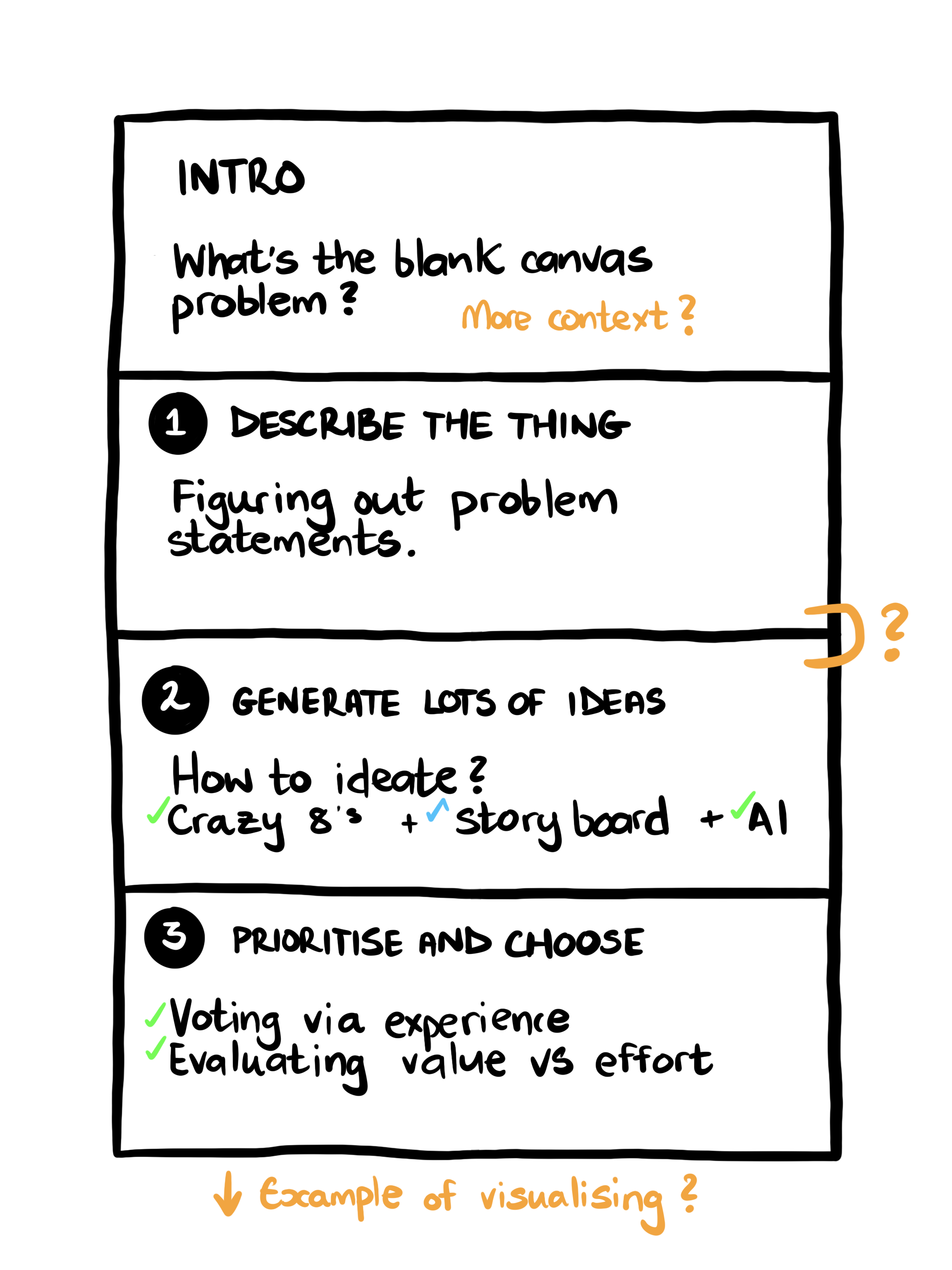 After voting and/or prioritising, we should be left with a list of the best concepts, and a foundation to expand on each, then materialise them into something useful in the real-world. With the examples that we explored, the final output is this very article that you're reading, along with the sketches and summary below.