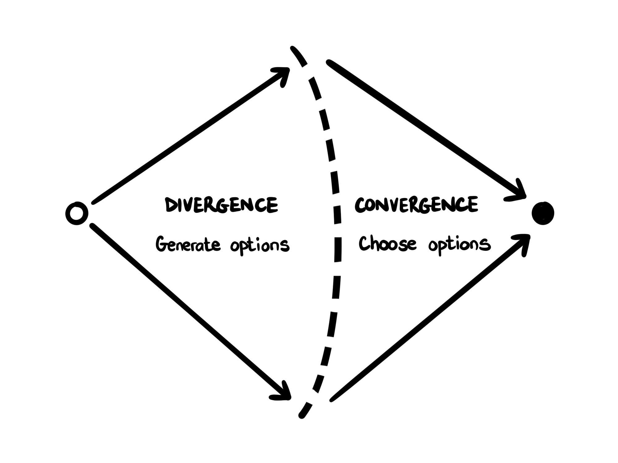 The process of generating many ideas and possibilities is divergent thinking. It's great for exploring the breadth of a problem space and creating many options that might be stuck in our heads. But this results in many ideas, some good, some junk, some realistic, some impossible. That's where convergence is needed.