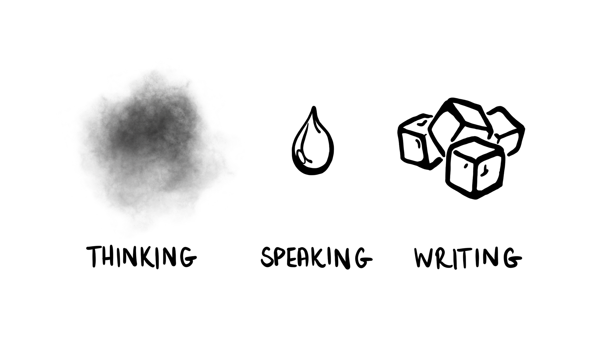 Ideas are like the phases of matter. Thinking about ideas = vapour, speaking about ideas = liquid, and putting ideas down on paper = solid.
