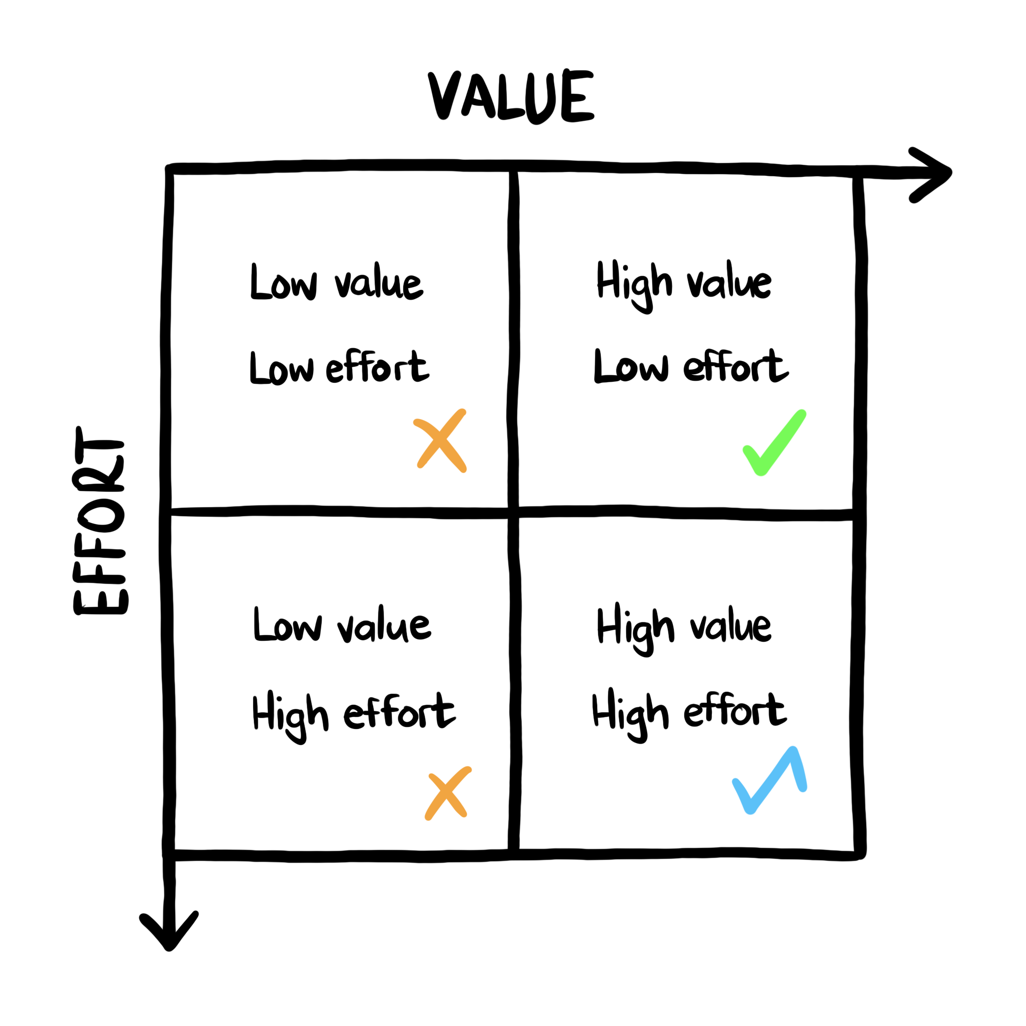 Another approach that can be used in conjunction to voting is prioritising. Without ruthlessly selecting a few options, we might be stuck in the opposite situation of the blank canvas - having too many ideas. Typically things can be rated by 1) how valuable they are, and 2) how difficult or complex they are to achieve. These measurements are typically guided by our own intuition, but supplementing that with a group's popular opinion often leads to more accuracy. Rank each idea's value, and how much effort or complexity it might have to see it through, then focus on the high value, low effort ones. Note: Although high value, low effort is good to get the ball rolling, high value, high effort is what makes groundbreaking thing happen.
