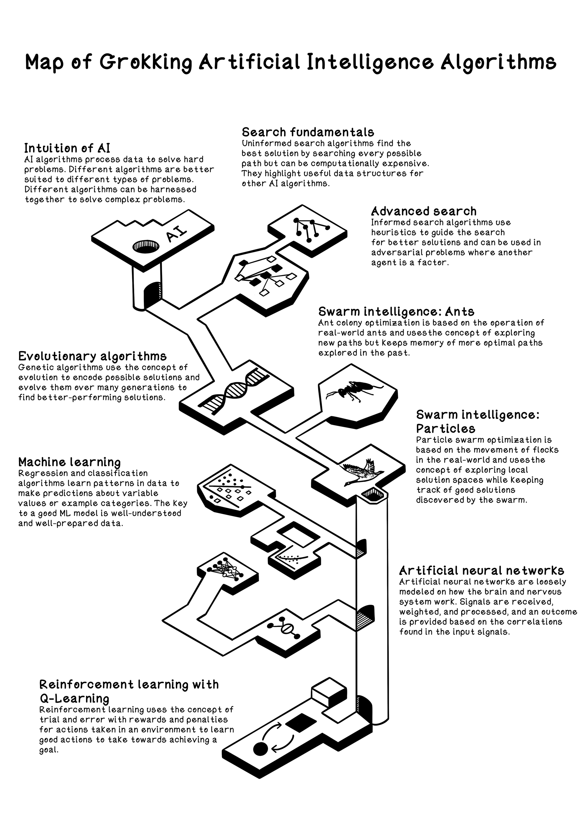 I wrote Grokking Artificial Intelligence Algorithms. The book is a fully-illustrated and interactive tutorial guide to the different approaches and algorithms that underpin AI. Written in simple language and with lots of visual references and hands-on examples, you’ll learn the concepts, terminology, and theory you need to effectively incorporate AI algorithms into your applications. And to make sure you truly grok as you go, you’ll use each algorithm in practice with creative coding exercises—including building a maze puzzle game, performing diamond data analysis, and even exploring drone material optimization.